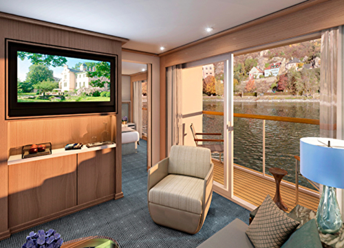 Suite size: 250 sq ft River-view suite with full-size veranda off the spacious, separate sitting r ... oom & floor-to-ceiling sliding glass door, known as a French balcony, in the sleeping quarters Hotel-style bed 79 in x 63 in (with optional twin-bed configuration); luxury linens & pillows Free Wi-Fi (connection speed may vary) Two 42″ flat-screen Sony TVs with infotainment system featuring Movies On Demand, plus CNBC, CNN, National Geographic & more 110/220 volt outlets & USB ports Telephone, safe, refrigerator, hair dryer & individual climate control Large private bathroom with spacious glass-enclosed shower Premium Freyja toiletries; plush robes & slippers Bottled water replenished daily Stateroom steward & twice-daily housekeeping Space under bed for storing suitcases Roomy wardrobe with wooden hangers Early check-in (no later than 12 PM) Complimentary Viking Air Plus, laundry & shoe shine services Welcome champagne; mini-bar with wine, beer & soft drinks (replenished daily); daily fruit plate Binoculars