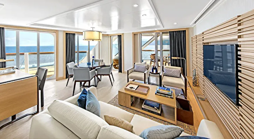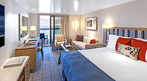 Stateroom size: 808–1,215 sq ft (includes private veranda) Ocean-view two-room suite with floor-t ... o-ceiling sliding glass door opening to a generous veranda (layout varies) Well-appointed living area & dining area that seats 4 11 AM Embarkation 11 AM priority stateroom access Priority shore excursion reservations 97 days prior to departure 3 priority reservations at each alternative restaurant 90 days prior to departure Priority spa treatment bookings 90 days prior to departure King-size Viking Explorer Bed (optional twin-bed configuration) with luxury linens & pillows Free Wi-Fi (connection speed may vary) 42″ flat-screen TV featuring MSNBC, FOX News, National Geographic and more Additional 42″ flat-screen interactive LCD TVs in living area 110/220 volt outlets & USB ports Large private bathroom with spacious glass-enclosed shower, bathtub, double-sink vanity, heated floor, anti-fog mirror & hair dryer Premium Freyja® toiletries Plush robes & slippers Direct-dial satellite phone & cell service Security safe Individual climate control Purified water refilled daily Welcome bottle of champagne Mini-bar with alcoholic beverages, soft drinks, water & snacks (replenished once daily) Binoculars Traditional Norwegian Marius-weave blanket Personal coffee machine with premium coffee & tea selections Stateroom steward & twice-daily housekeeping 24-hour room service Complimentary laundry, dry cleaning, pressing & shoe shine services Under-bed suitcase storage space Spacious drawers & closet with wooden hangers
