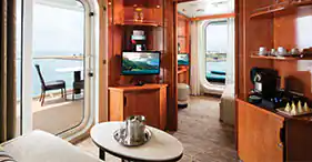 With room for up to four guests, these staterooms are great for the family to cruise together and s ... pread out in comfort. They include two lower beds that convert into a queen-size bed, a convertible sofa and a pullman bed. Along with a sitting area and floor-to-ceiling glass doors that open to a private balcony. Plus some can connect so your group can spread out even more.
