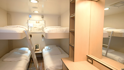 Relax in these comfortable, standard inside cabins with separate beds where one can be turned into ... a sofa. This cabin can fit up to four people. 6 – 10 m2 No window Bathroom TV 1 bed/1 couch