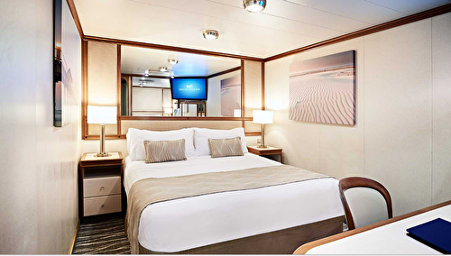 These staterooms are the perfect place to recharge your batteries. Our most affordable option, feat ... uring two twin beds or a queen-size bed. Other amenities include a refrigerator, hair dryer, TV, closet and bathroom with shower. Approx. 158 to 162 sq ft. Comfortable queen or two twin beds Refrigerator. Flat-panel television Private bathroom with shower 100% cotton, high-thread count linens Complimentary 24-hour room service Spacious closet Desk with chair Hair dryer & bathroom amenities Digital security safe