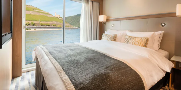 Stateroom size: 135 sq ft River-view stateroom with floor-to-ceiling sliding glass door to create ... a French balcony Hotel-style bed 79 in x 63 in (with optional twin-bed configuration); luxury linens & pillows Free Wi-Fi (connection speed may vary) 42″ flat-screen Sony TV with infotainment system featuring Movies On Demand, plus CNBC, CNN, FOX, National Geographic & more 110/220 volt outlets & USB ports Telephone, safe, refrigerator, hair dryer & individual climate control Private bathroom with spacious glass-enclosed shower, heated bathroom floor & anti-fog mirror Premium Freyja toiletries; plush robes & slippers available upon request Bottled water replenished daily Stateroom steward & twice-daily housekeeping Space under bed for storing suitcases Roomy wardrobe with wooden hangers