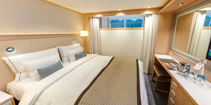 Stateroom size: 150 sq ft River-view stateroom with half-height picture window Hotel-style bed 79 ... in x 63 in (with optional twin-bed configuration); luxury linens & pillows Free Wi-Fi (connection speed may vary) 42″ flat-screen Sony TV with infotainment system featuring Movies On Demand, plus CNBC, CNN, FOX, National Geographic & more 110/220 volt outlets & USB ports Telephone, safe, refrigerator, hair dryer & individual climate control Private bathroom with spacious glass-enclosed shower, heated bathroom floor & anti-fog mirror Premium Freyja toiletries; plush robes & slippers available upon request Bottled water replenished daily Stateroom steward & twice-daily housekeeping Space under bed for storing suitcases Roomy wardrobe with wooden hangers