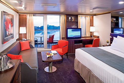 These suites feature spa amenities such as yoga mats and access to spa treatments from the Greenhou ... se Spa & Salon. These large, comfortable suites feature a spacious sitting area with floor-to-ceiling windows overlooking a private verandah, two lower beds convertible to one queen-size bed—our signature Mariner’s Dream™ bed with plush Euro-Top mattresses, and one sofa bed for one person. The bathroom includes a dual-sink vanity, full-size whirlpool bath and shower, and an additional shower stall. The configuration of staterooms may vary from the images shown.