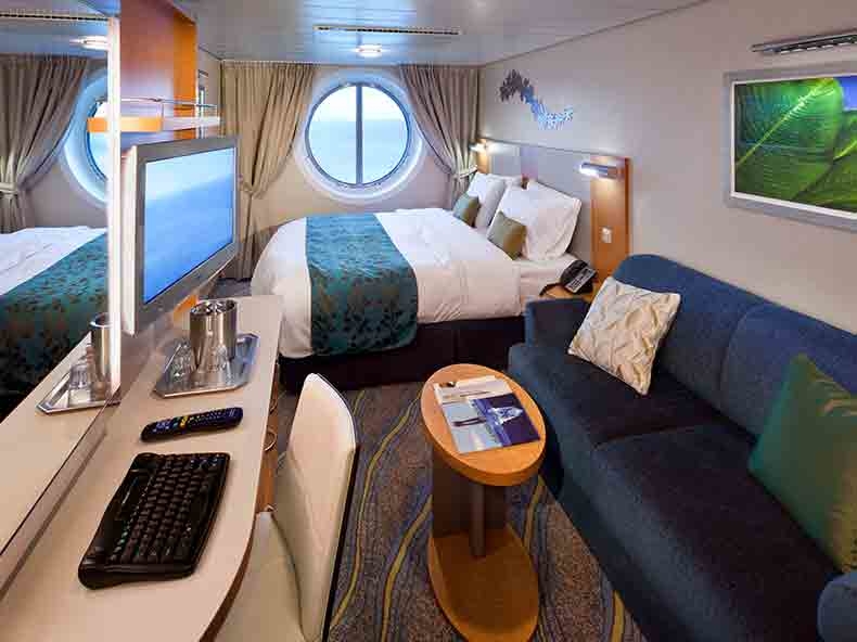 All staterooms and suites come complete with private bathroom, vanity area, hair-dryer, closed-circ ... uit TV, radio and phone. Two twin beds that convert to Royal King, private bathroom and sitting area. Up to 4 guests. Stateroom: 140 sq. ft.