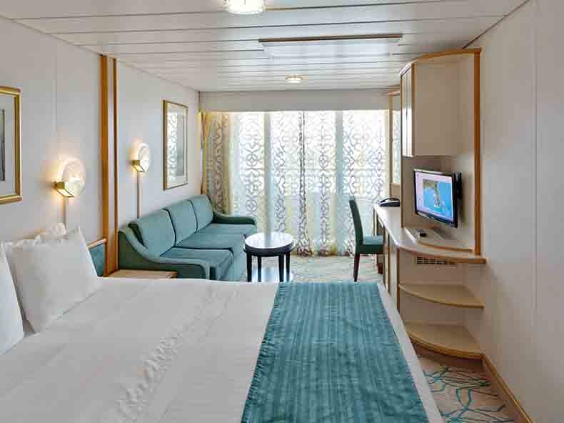 All staterooms and suites come complete with private bathroom, vanity area, hair-dryer, closed-circ ... uit TV, radio and phone. Two twin beds that convert to Royal King, sitting area, private balcony and private bathroom. Stateroom: 195 sq. ft. Balcony: 35 sq. ft.