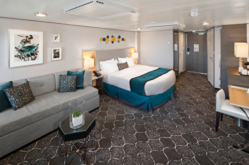 All staterooms and suites come complete with private bathroom, vanity area, hair-dryer, closed-circ ... uit TV, radio and phone. Two twin beds that convert to Royal King, private bathroom and sitting area. Up to 4 guests. Stateroom: 140 sq. ft.