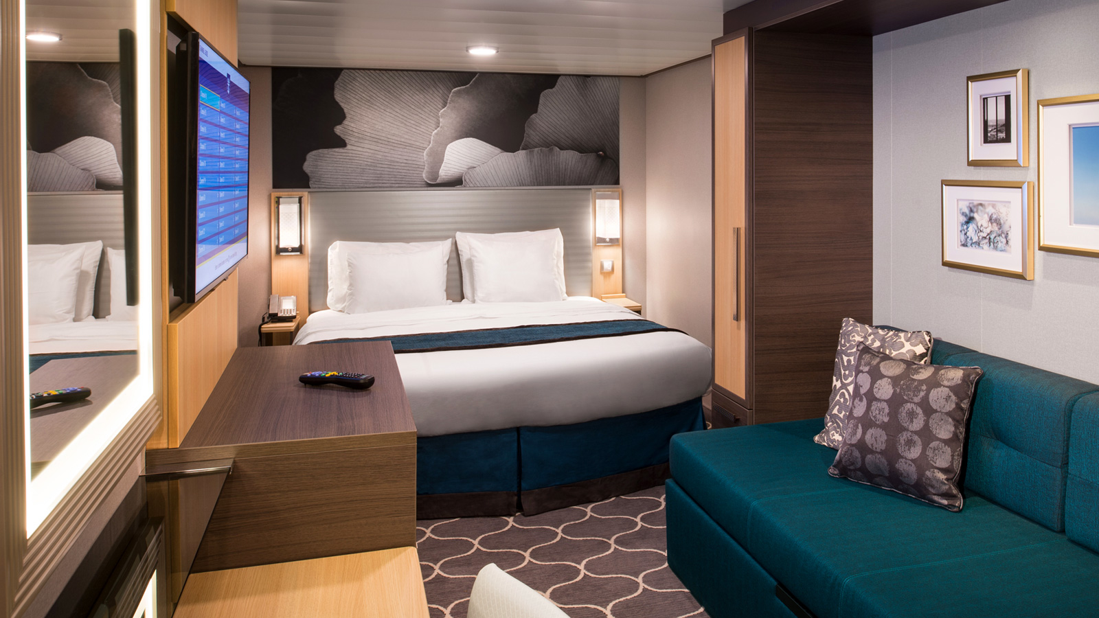 All staterooms and suites come complete with bathroom, vanity area, hair-dryer, TV and phone. Two t ... win beds that convert to a Royal King bed. One double sofa bed in staterooms with up to 4 guests Stateroom: 179 sq. ft.